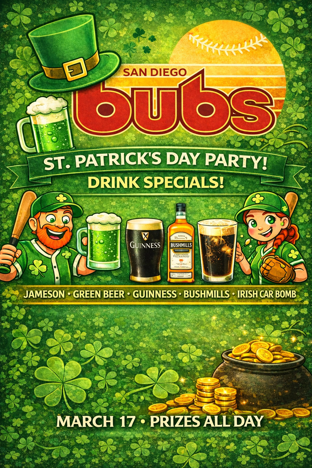 Grab your best green garb and join us for St. Patrick's Day! $5 Green Bud Light Draft $7 Guinness $7 Bushmills $9 Jameson $10 Car Bombs