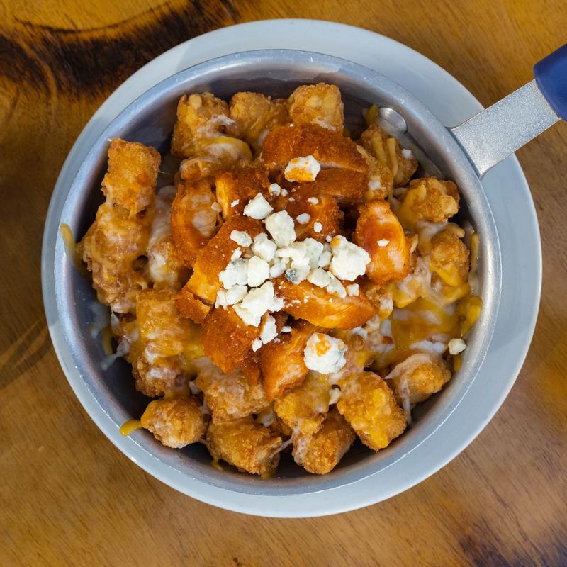 All the fun without the stick! These mini chicken corn dogs are a wo/man’s best friend. Cooked to a perfect golden brown and piled high with tater tots.