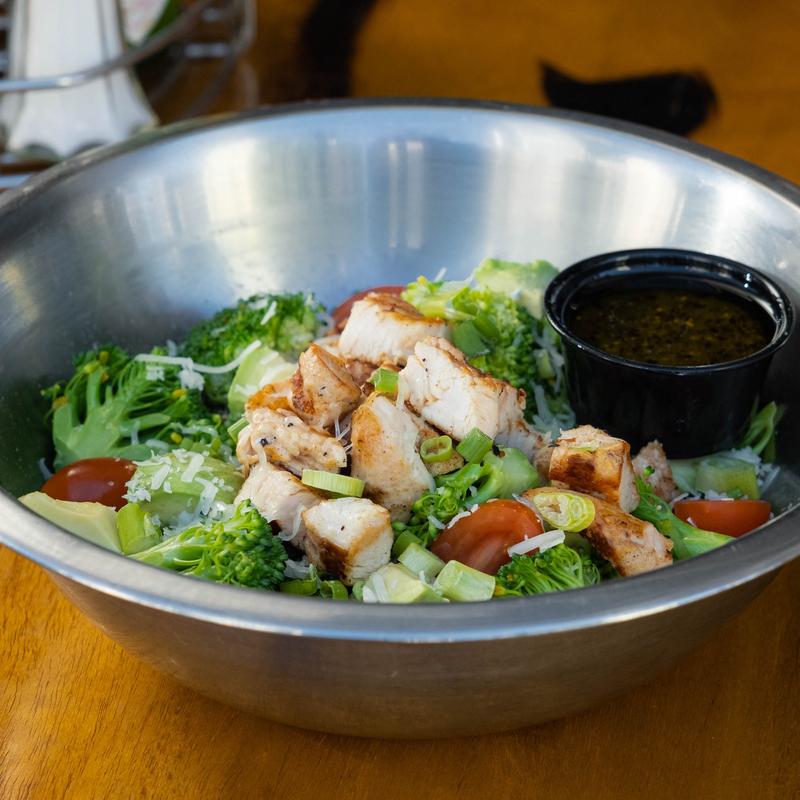 Chicken and fresh romaine lettuce tossed in our ZESTY housemade Caesar dressing, topped with parmesan cheese and housemade croutons. We named it after our all-time favorite chef, Jim Hill! (‘Cause we stole his recipe...)