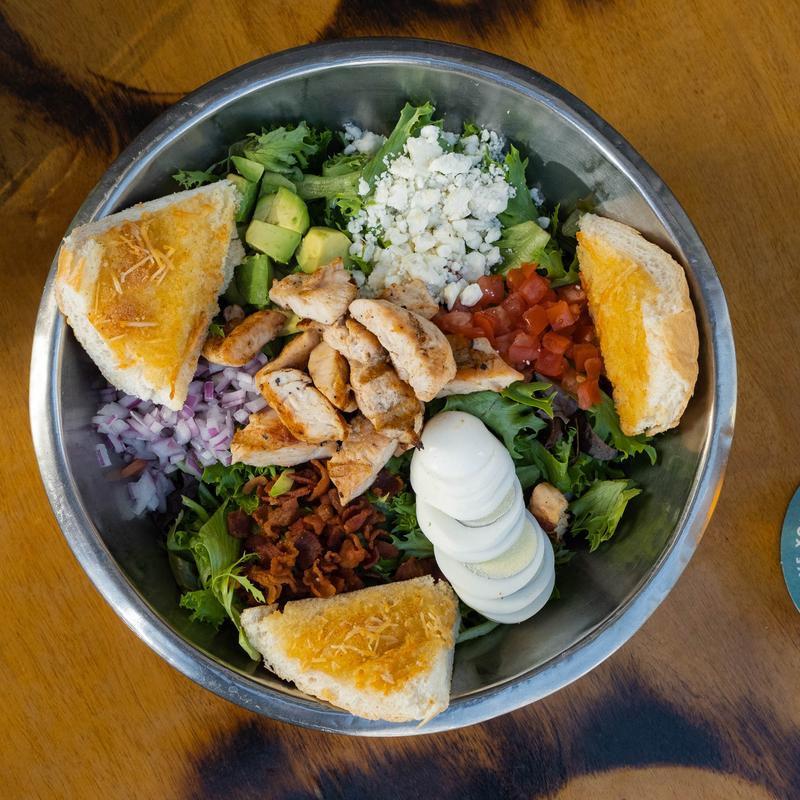 Mixed greens with grilled chicken, bacon, avocado, red onion, tomato, blue cheese crumbles and slices of hard-boiled egg & garlic bread. Marvin who?